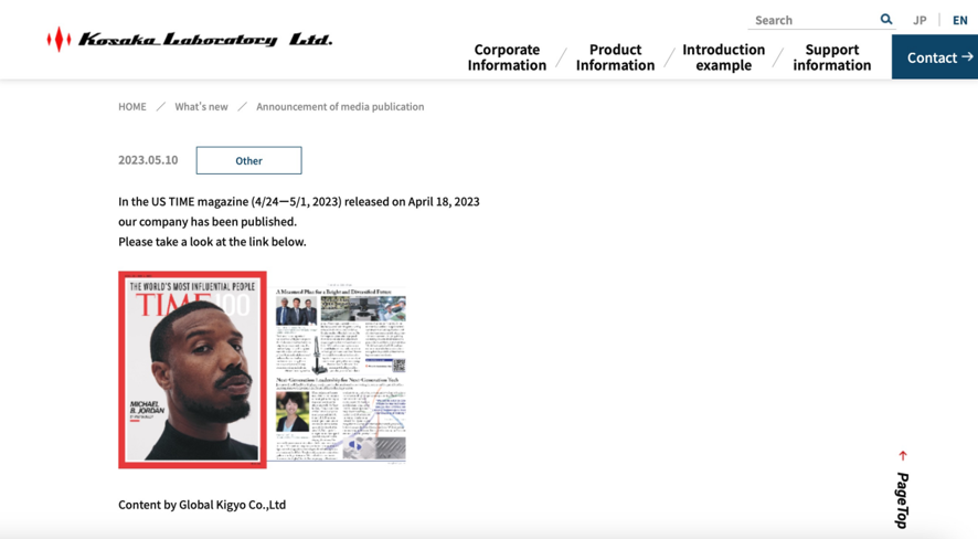 株式會社小坂研究所登上美國《時代》雜志報道。(2023年4月18日發(fā)行的4/24-5/1期刊)在此與廣大客戶、經(jīng)銷商朋友分享喜訊,報道內(nèi)容歡迎查看下方英文原文以及中文翻譯!