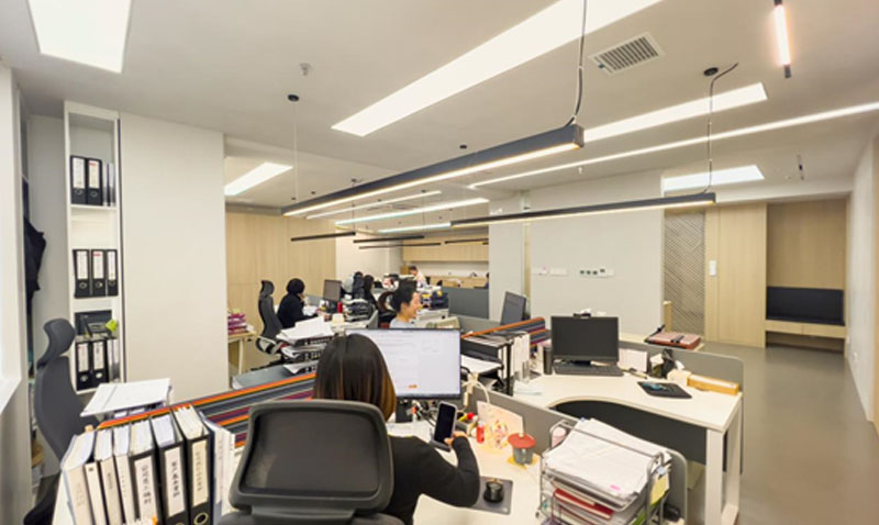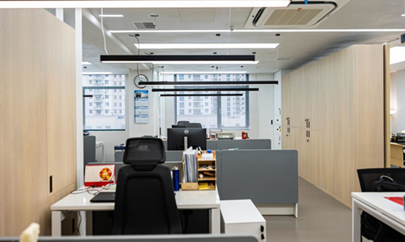 辦公區(qū),原木色調(diào),溫暖親切。橫廳設(shè)計(jì),開闊通透,方便工作溝通,日常交流。