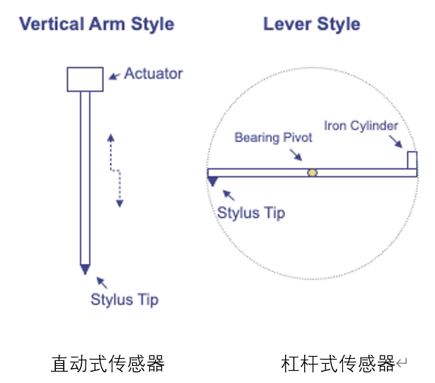 市面上常見的臺階儀傳感器主要分為兩種,即杠桿式傳感器和直動式傳感器。兩者傳感器,因其動作原理不同,主要差別體現(xiàn)在以下幾個方面:
