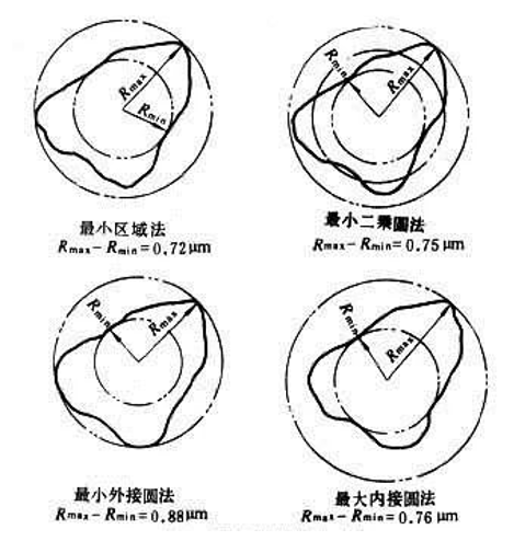 3. 最小外接圓法:只適用于外圓。以包容被測圓輪廓且半徑為最小的外接圓圓心為圓心,所作包容被測圓輪廓的兩同心圓半徑差即為圓度誤差。