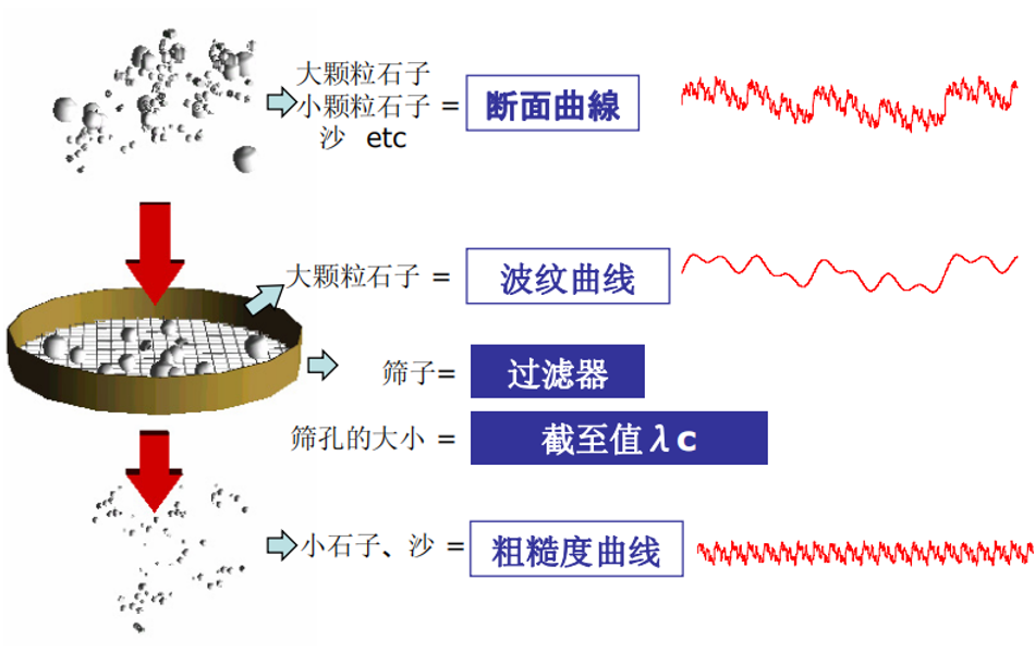 物體表面放大萬倍時,的確能看到其表面的起伏變化,但是這種變化有大有小??傮w的起伏變化,我們可以稱之為斷面曲線(Profile),斷面曲線由兩部分構(gòu)成:波紋曲線(Waviness)和粗糙度曲線(Roughness)。兩者的區(qū)別在于“波長”的差異。如下圖,一捧砂礫大小不一的沙石經(jīng)過一個孔隙均勻的篩子后,留在篩子中的大顆粒石子的曲線變化就是“波紋曲線”,漏下去的小顆粒石子的曲線變化就是“粗糙度曲線”,將二者過濾開的篩子就是“過濾器”,篩孔的大小就是“截斷值λc”,常用英文“Cutoff”表示。就好像你可以自行選擇篩孔大小不一的篩子,在測量過程中,你也可以選擇不同的截斷值來評估產(chǎn)品的表面粗糙度(Roughness)。