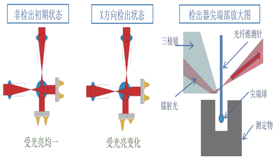 FP3030使用高彈性光纖維測針,結(jié)合激光、三棱鏡與光電二極管共同構(gòu)成傳感測量裝置。未測量狀態(tài)下,光電二極管受光量均一;測量狀態(tài)下,測針進(jìn)入深孔,以圓周型軌跡接觸深孔側(cè)壁采集數(shù)據(jù),由于測針位置的變化,光電二極管受光量發(fā)生變化,F(xiàn)P3030由此測量出深孔內(nèi)部的表面形貌。