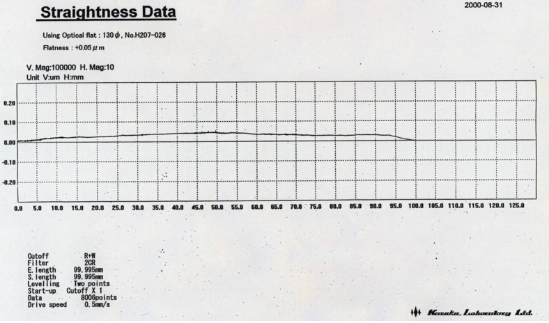 株式會(huì)社小坂研究所專注于精密測(cè)量設(shè)備的制造,對(duì)移動(dòng)軸直線度的保證有著自己的核心技術(shù)。Kosaka ET系列臺(tái)階儀,能夠達(dá)到100mm的測(cè)量長(zhǎng)度上,其直線度的偏差量小于0.2um——也就是說(shuō),如果偏移量是以移動(dòng)方向?yàn)檩S心線形成的圓柱,小班研究所可以將這個(gè)圓柱做到高度為100,000um,但半徑小于0.2um的程度,從而保證還原樣品表面的真實(shí)形貌和臺(tái)階高度。